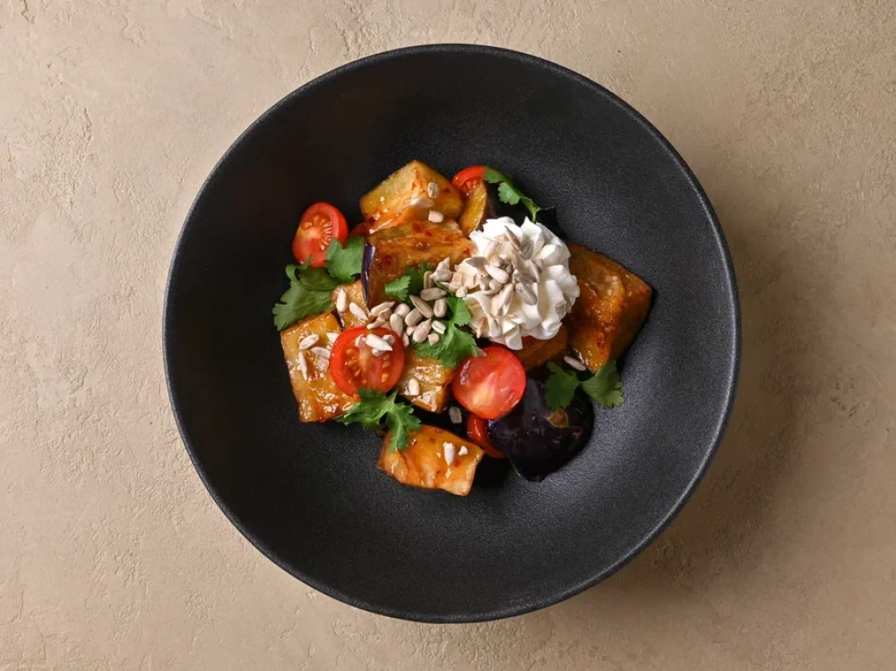Баклажаны обжаренные во фритюре, в соусе сладкий чили с томатами черри, сливочным сыром, кинзой и семенами подсолнечника