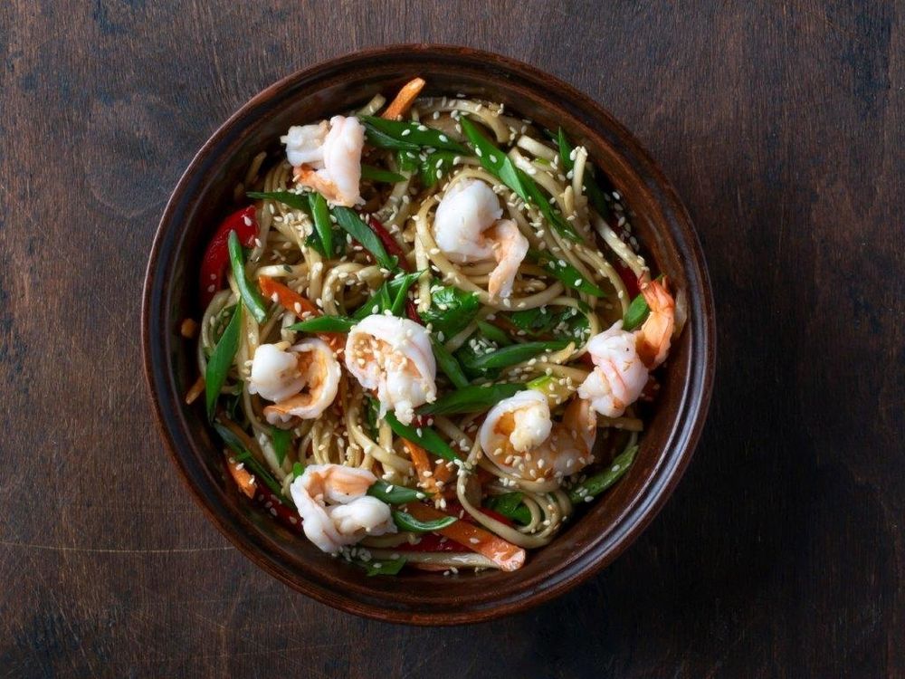 Тигровые креветки, перец, цукини, лук, морковь, зелень, кунжут