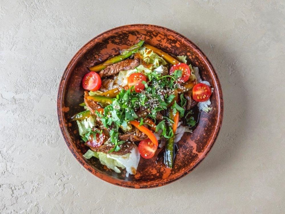 Говядина, салат айсберг, томаты черри, перец болгарский, лук репчатый, соус свит чили, соус соевый, кинза, кунжут