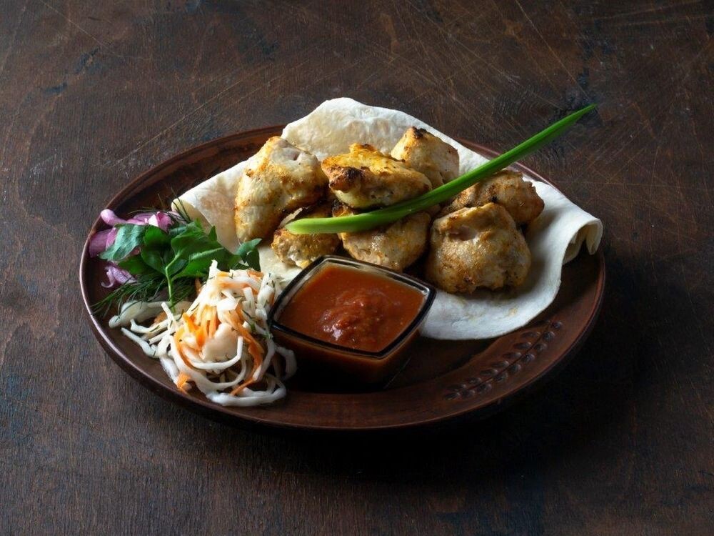 Куриная грудка, капустный салат, маринованный лук, лаваш, соус фирменный (томатный)