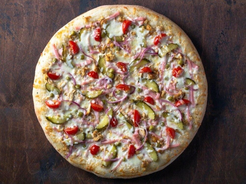 Сыр моцарелла, ветчина, цыпленок, огурцы соленые, зеленый горошек, помидоры черри, маринованный лук, сливочный соус