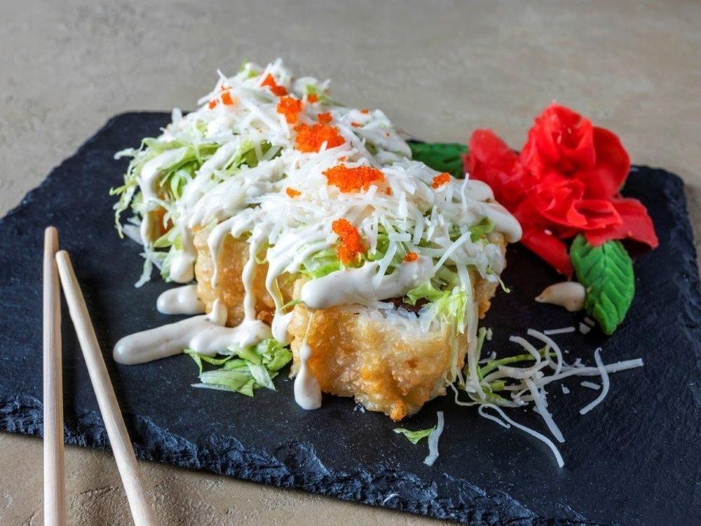 Филе куриное,помидор,салат айсберг,соус цезарь,кляр,тобико, сыр пармезан