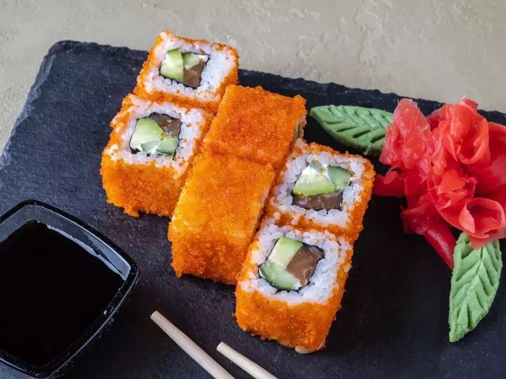 Лосось свежий,огурец,авокадо,майонез,икра тобико