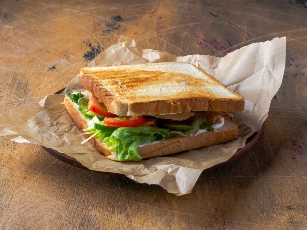 Хрустящий тост, свежие огурцы, помидоры, листья салата "Айсберг",соус чесночный, ветчина, сыр Моцарелла