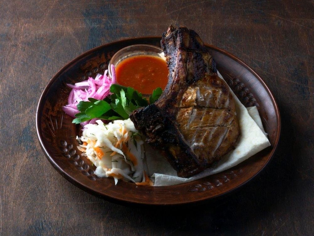 Свинина на ребре 2 шт., капустный салат, маринованный лук, лаваш, соус фирменный (томатный)