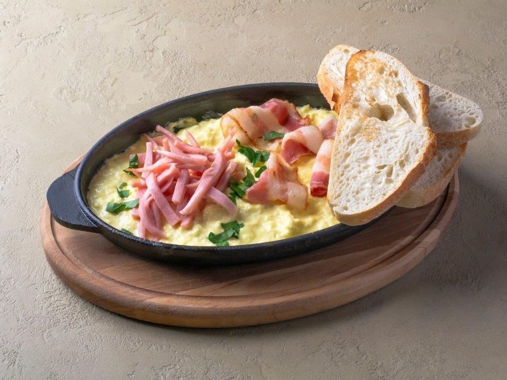 Скрэмбл из двух яиц с беконом и ветчиной