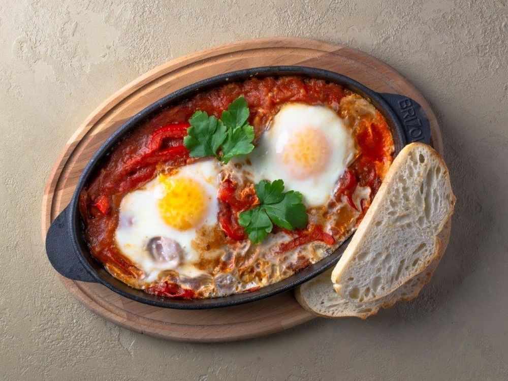 Из 2 яиц , жаренных в соусе из помидоров, болгарского перца и приправ