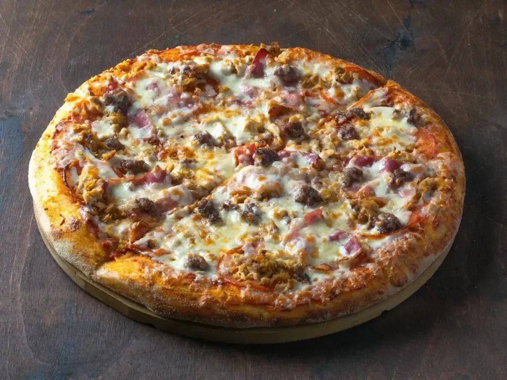 Цыпленок, митболы из говядины, пикантная пепперони, томатный соус, моцарелла, бекон