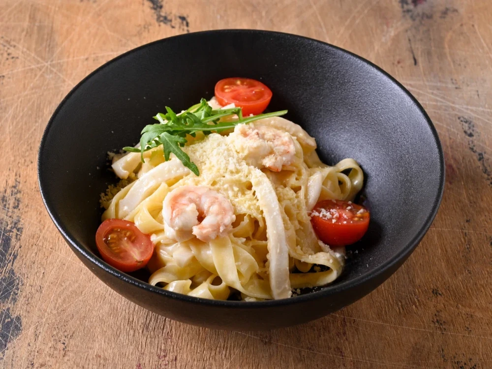 Паста, сливочный соус, цукини, томаты черри, пармезан