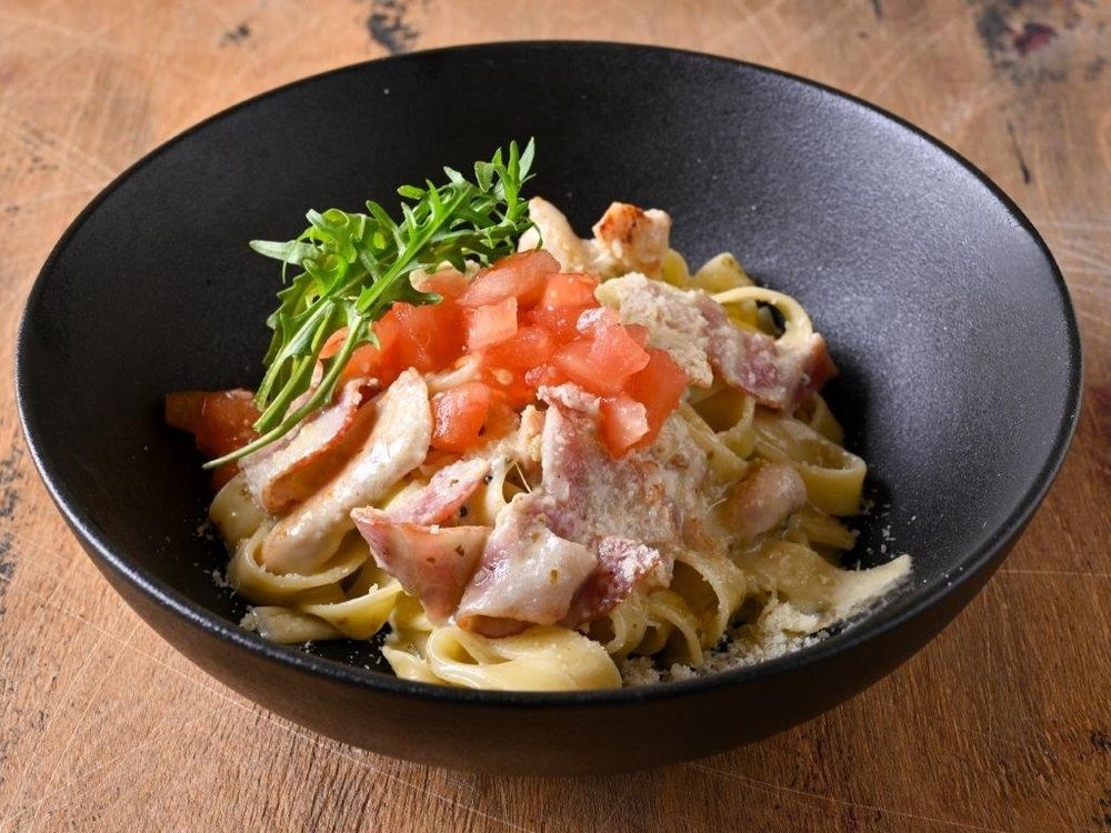 Паста, сливочный соус, бекон,томаты черри, пармезан