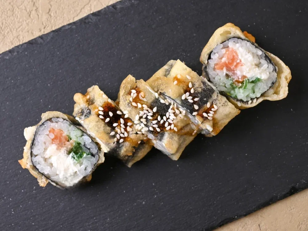 Сливочный сыр, салат чука, лосось, кляр темпура, соус унаги, кунжут