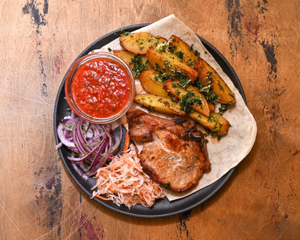 Свинина обжаренная на огне с фирменным картофелем "Форест", шашлычным соусом, красным луком и маринованной капустой