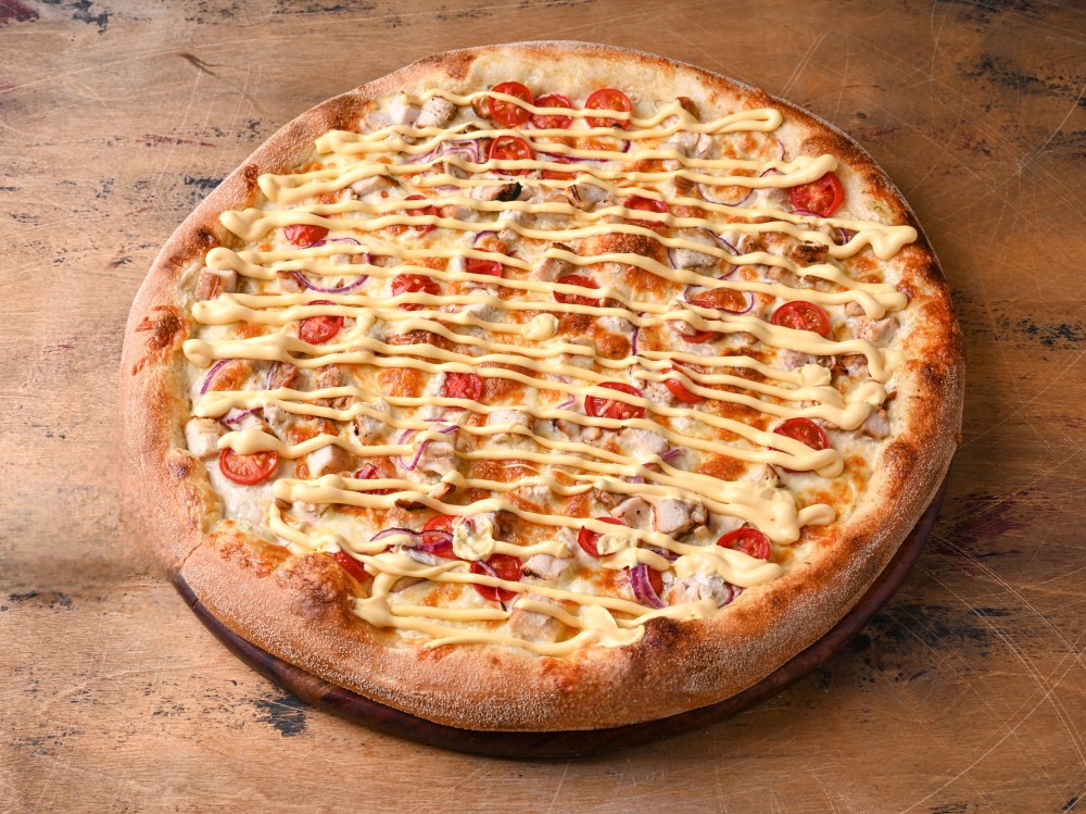 Сливочный соус, моцарелла, куриное филе, томаты черри, лук красный, соус сырный.